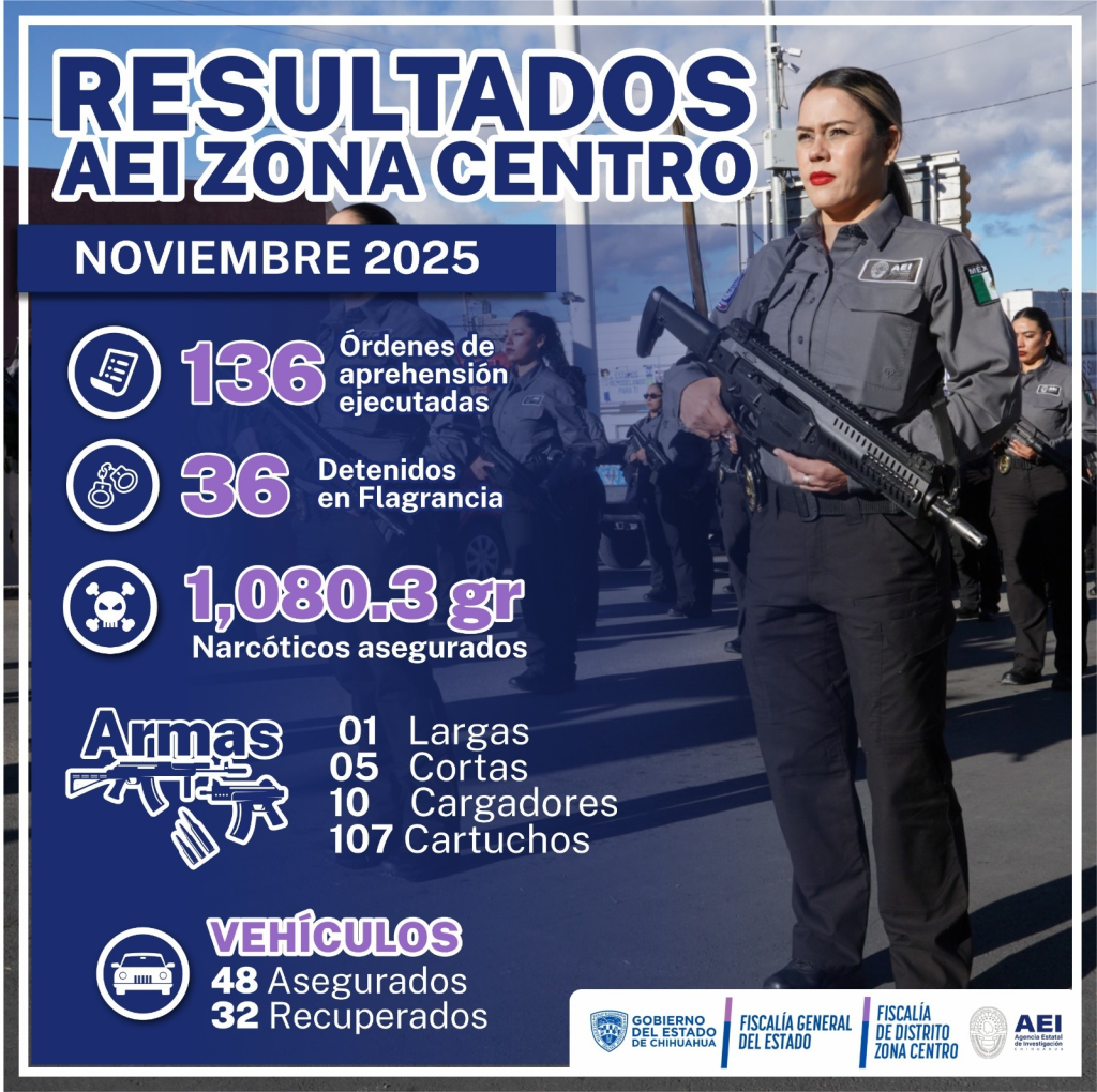 La lucha contra el delito no bajó el ritmo durante noviembre. La Agencia Estatal de Investigación (AEI), adscrita a la Fiscalía de Distrito Zona Centro, logró cumplimentar 136 órdenes de aprehensión, como resultado de una intensa estrategia operativa desplegada en la región.