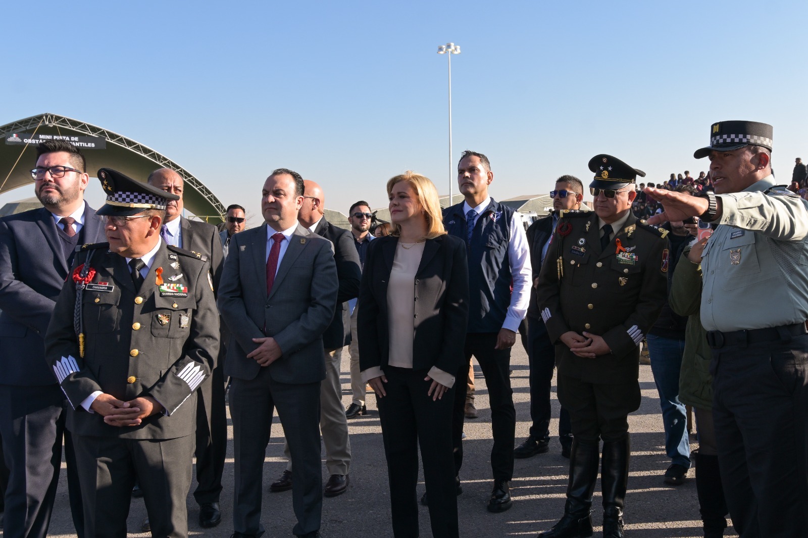 La gobernadora Maru Campos acudió como invitada de honor a la ceremonia de inauguración de la exposición militar “La Gran Fuerza de México”, en la que la Secretaría de la Defensa Nacional (Sedena) muestra a la ciudadanía parte de su equipo y esquema de trabajo.