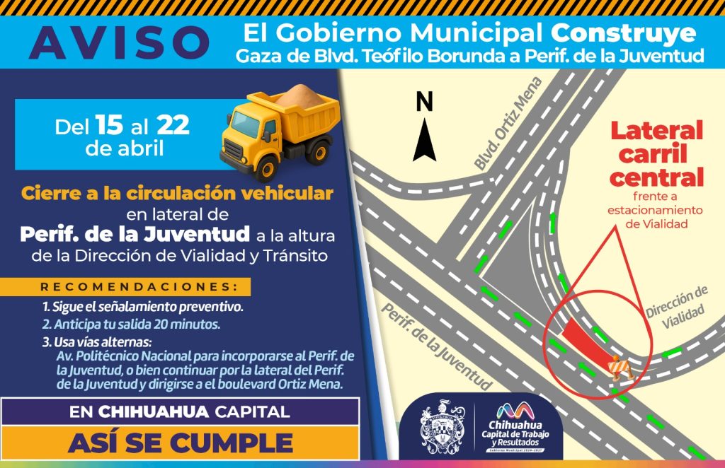 El Gobierno Municipal de Chihuahua anunció el cierre temporal de un tramo en la lateral del Periférico de la Juventud, a la altura de la Dirección de Vialidad y Tránsito, debido a trabajos de modernización de la red de agua potable.