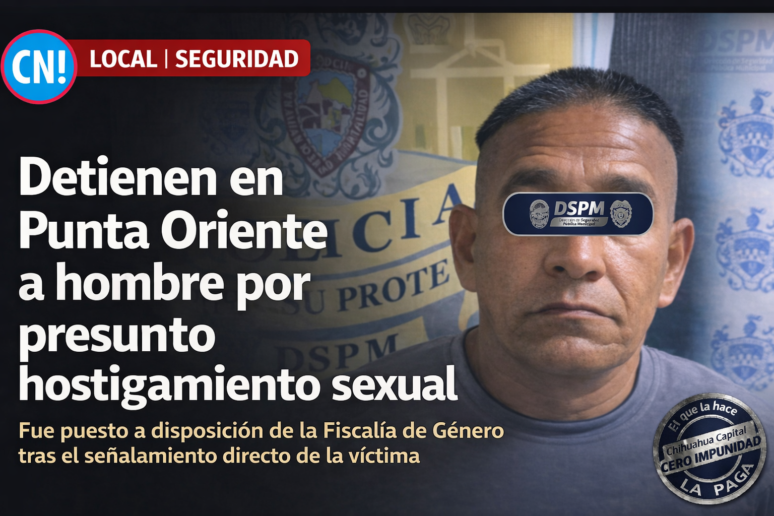 Elementos de la Policía Municipal aseguraron a un hombre en la colonia Punta Orient, al oriente de la ciudad de Chihuahua, por su probable responsabilidad en el delito de acoso u hostigamiento sexual en agravio de una mujer.