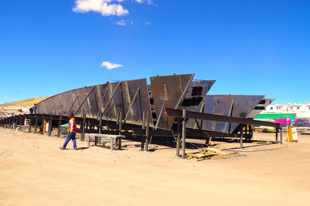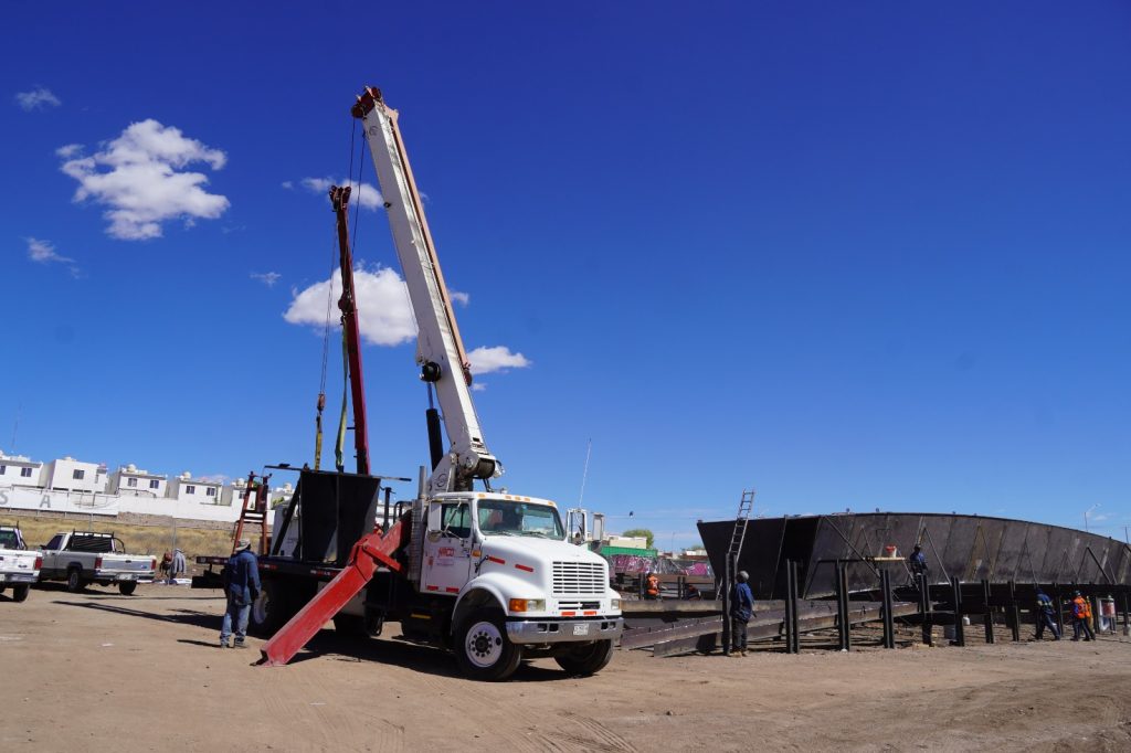• Estructura metálica: Fabricación de vigas de acero —incluyendo vigas tipo cajón y del arco— en un taller cercano al sitio.