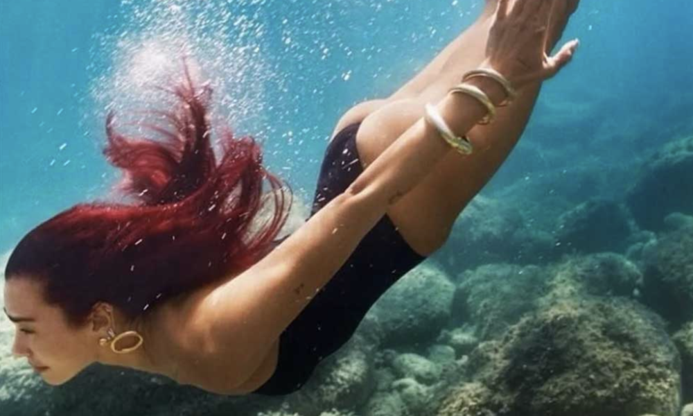 Dua Lipa flota en el océano mientras el sol se oculta detrás de ella. Su imagen proyecta fuerza y serenidad, aunque se ve amenazada por la...