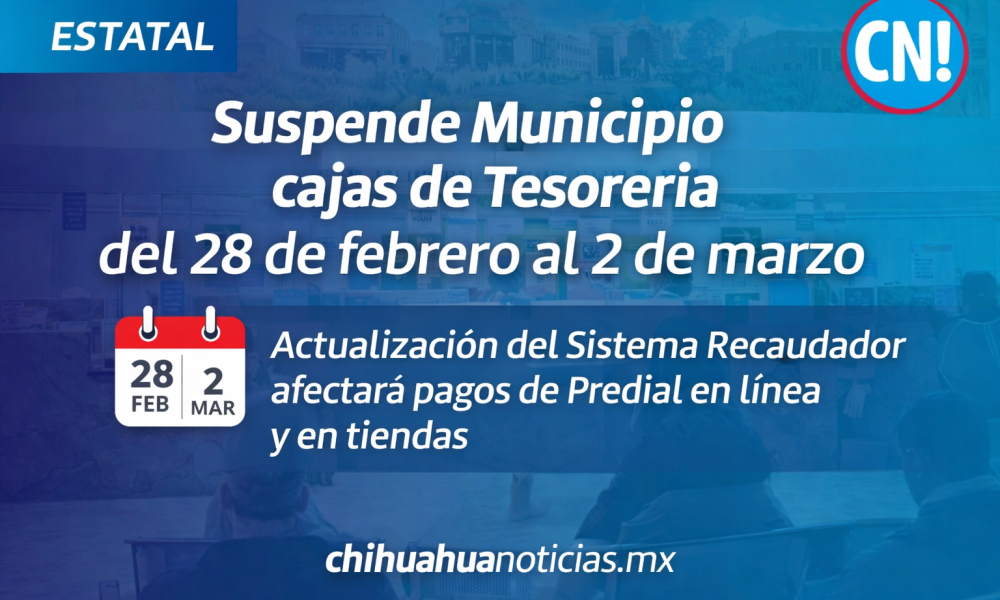 . El Gobierno Municipal de Chihuahua informó que las cajas receptoras de la Tesorería Municipal suspenderán temporalmente el servicio de pagos desde el sábado 28 de...