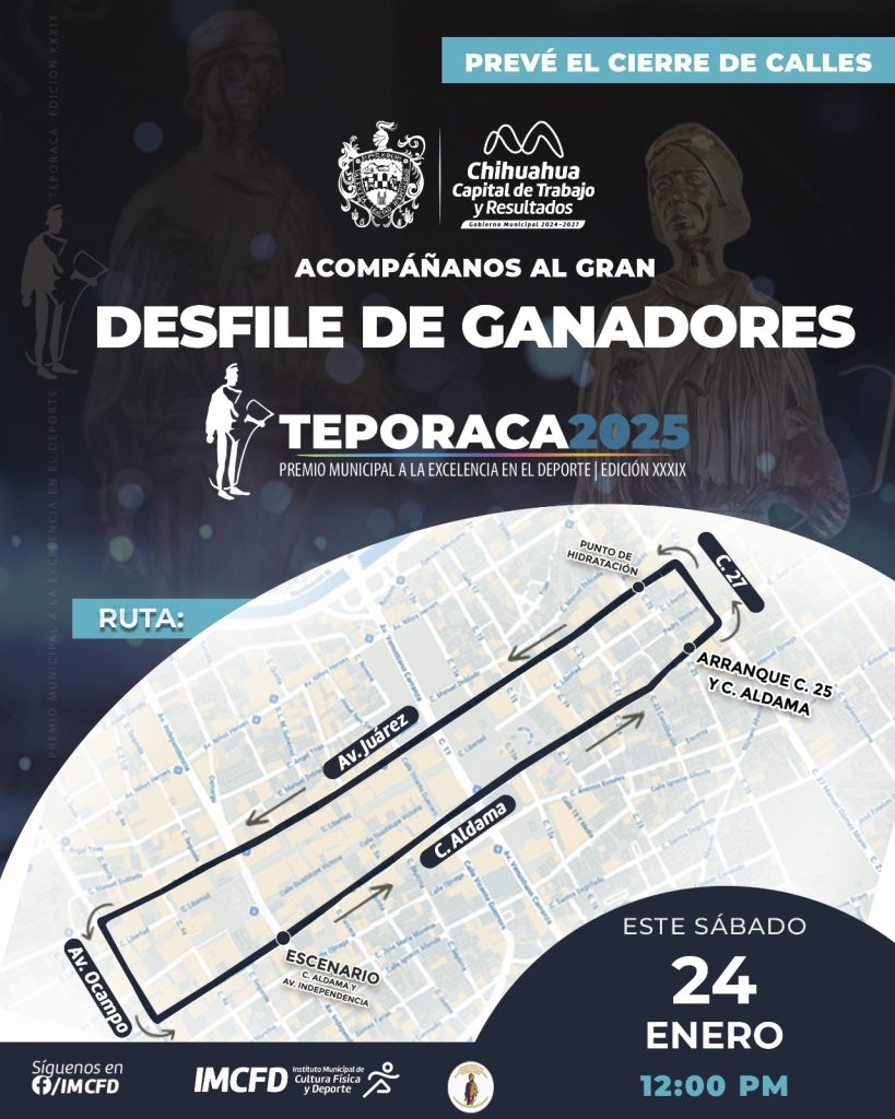 El Gobierno Municipal de Chihuahua anunció el cierre temporal de varias calles del primer cuadro de la ciudad debido al tradicional desfile de los ganadores del Premio Municipal a la Excelencia en el Deporte “Teporaca”, que se realizará el sábado 24 de enero a partir de las 12:00 horas.