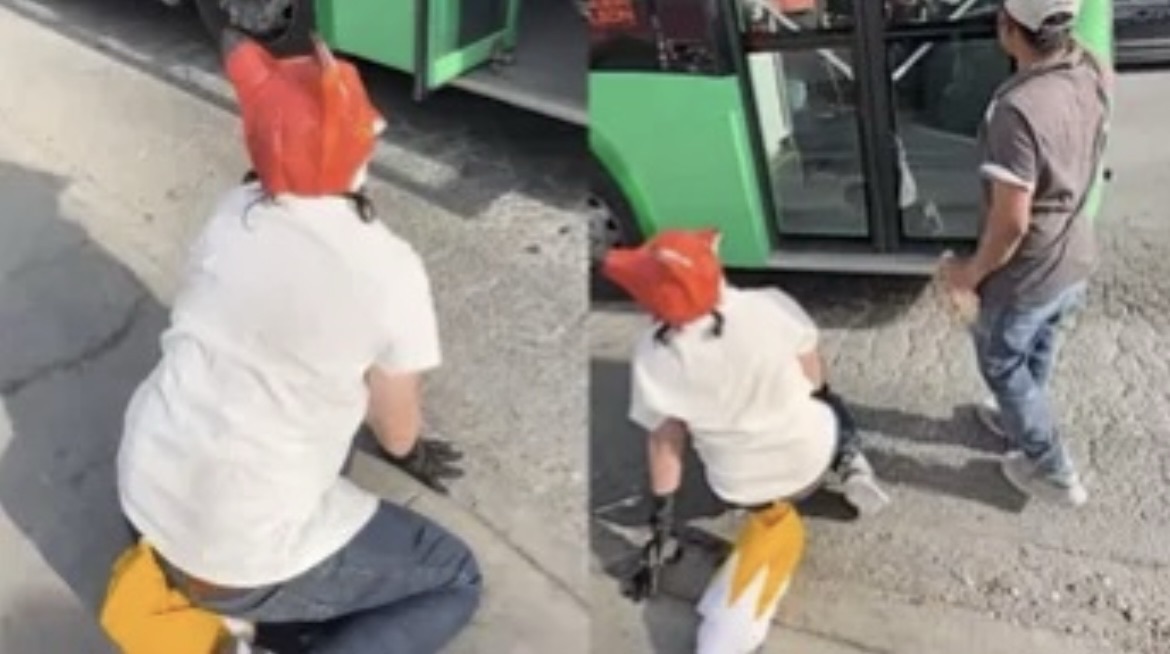 En el video se muestra cuando el conductor cierra las puertas del camión urbano de forma abrupta para evitar que el joven vestido de zorro abordara la unidad.