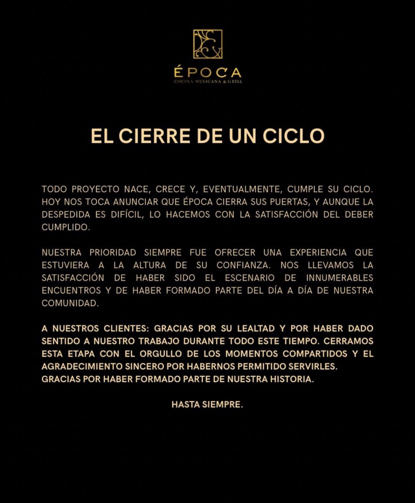 El restaurante Época Cocina Mexicana & Grill, ubicado en Distrito 1 —una de las zonas más exclusivas de la capital—, anunció el cierre definitivo de sus operaciones a través de un comunicado oficial, marcando el fin de un proyecto gastronómico que formó parte del dinamismo culinario de la ciudad.