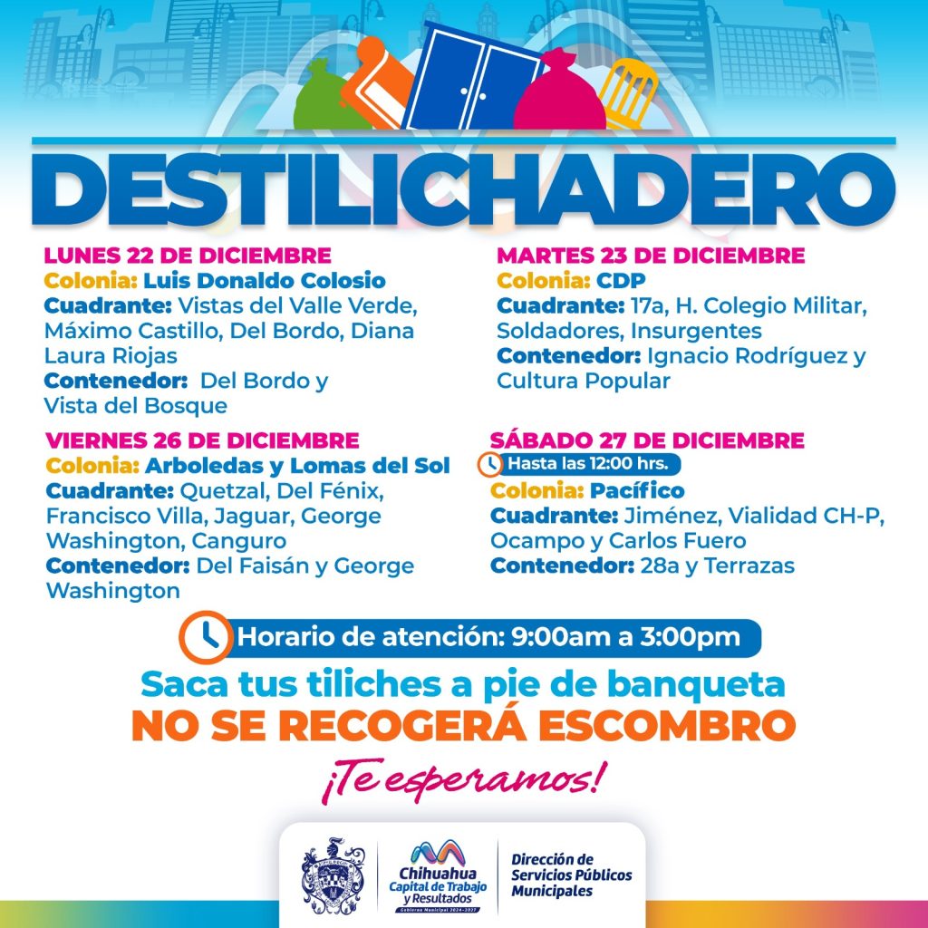 Con la intención de cerrar el año con hogares más limpios y calles libres de focos de infección, el Gobierno Municipal de Chihuahua, a través de la Dirección de Servicios Públicos Municipales, dio a conocer el calendario del programa Destilichadero, que se realizará del 22 al 27 de diciembre en diversas colonias de la capital.