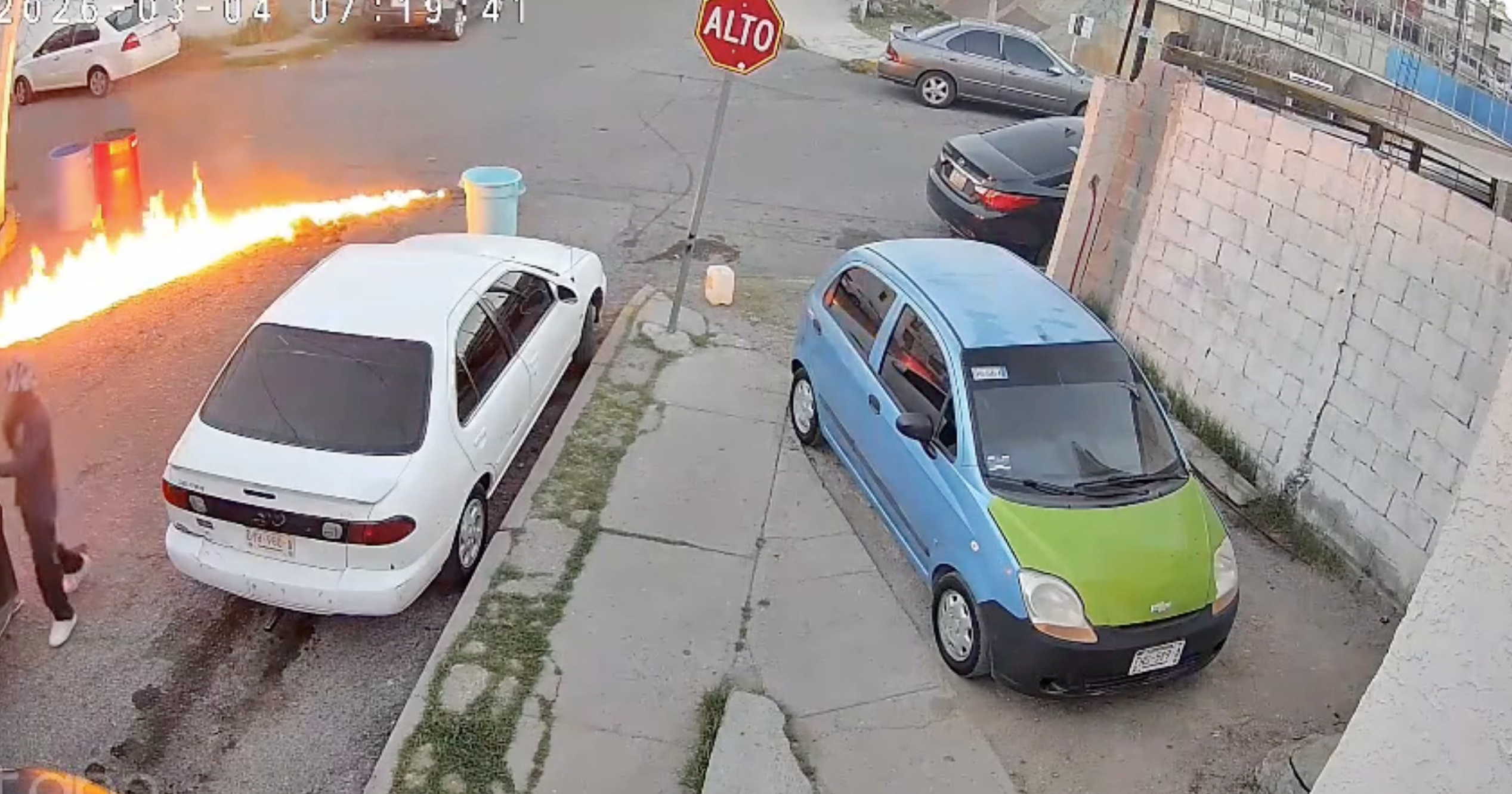 Tras la combustión, ambos empleados se alejan del sitio mientras observan el fuego que se propagó por algunos segundos sobre el pavimento.