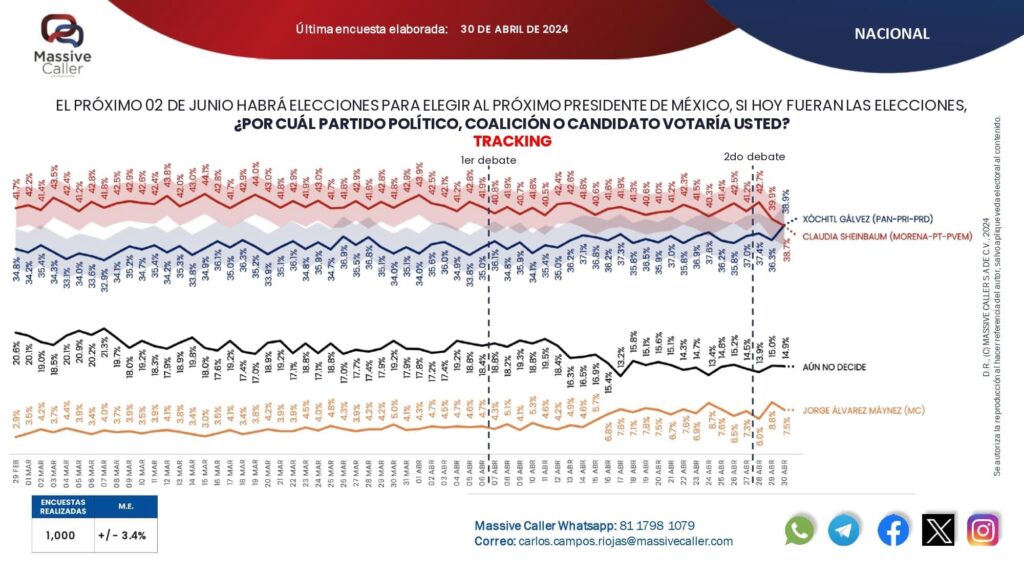 Massive Caller es la primer encuestadora reconocida a nivel nacional que pone en empate técnico la elección presidencial entre ambas candidatas.