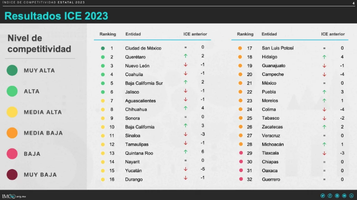 El ICE 2023 realizado por el Instituto Mexicano para la Competitividad (IMCO), apunta que 10 estados mejoraron su posición, 13 retrocedieron y 9 se mantuvieron igual.