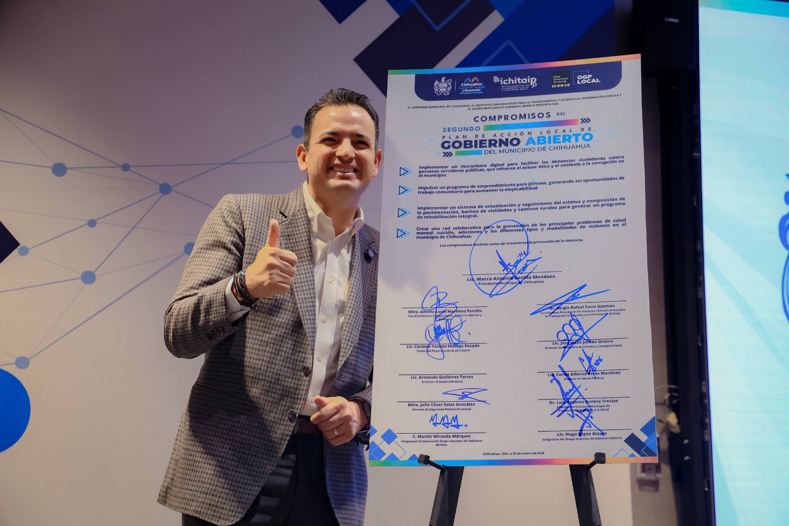 “Con la firma de estos compromisos, reiteramos que el gobierno abierto en Chihuahua no es una excepción: es una ruta. Una ruta que apuesta por la innovación pública, por el uso de tecnologías, por lenguaje claro, por formatos abiertos y por una participación ciudadana cada vez más incidente”, expresó el alcalde.