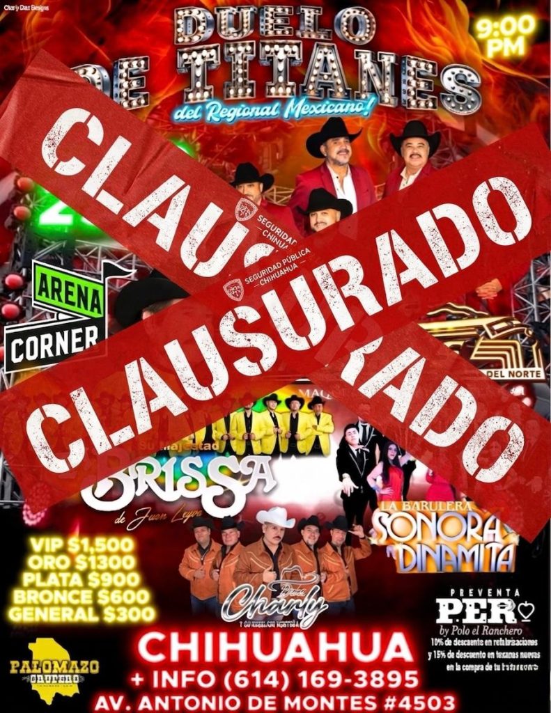 Chihuahua, Chih.— Lo que prometía ser una noche de música regional terminó en un episodio de tensión y desorden, luego de que una riña entre integrantes de un grupo de ballet interrumpiera un evento en la Arena Corner Sport, provocando su clausura por parte de autoridades municipales.