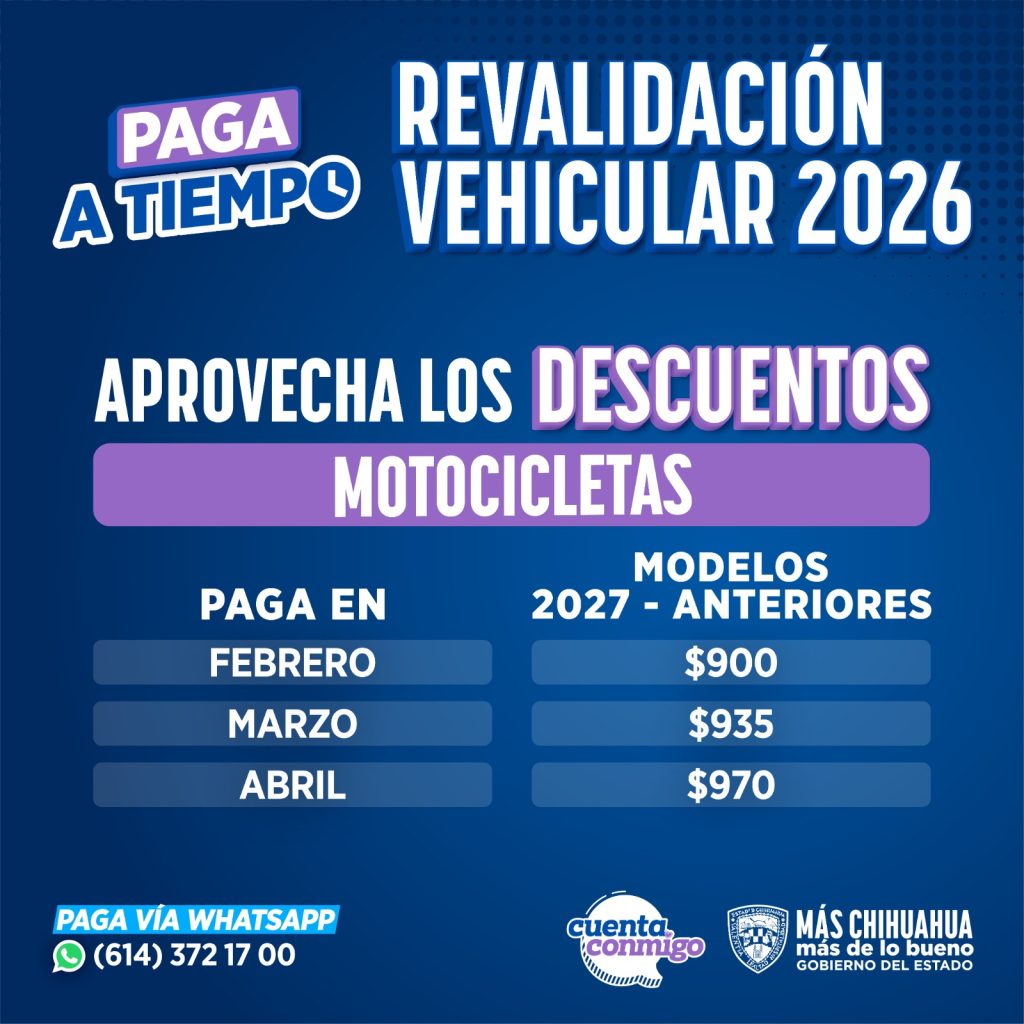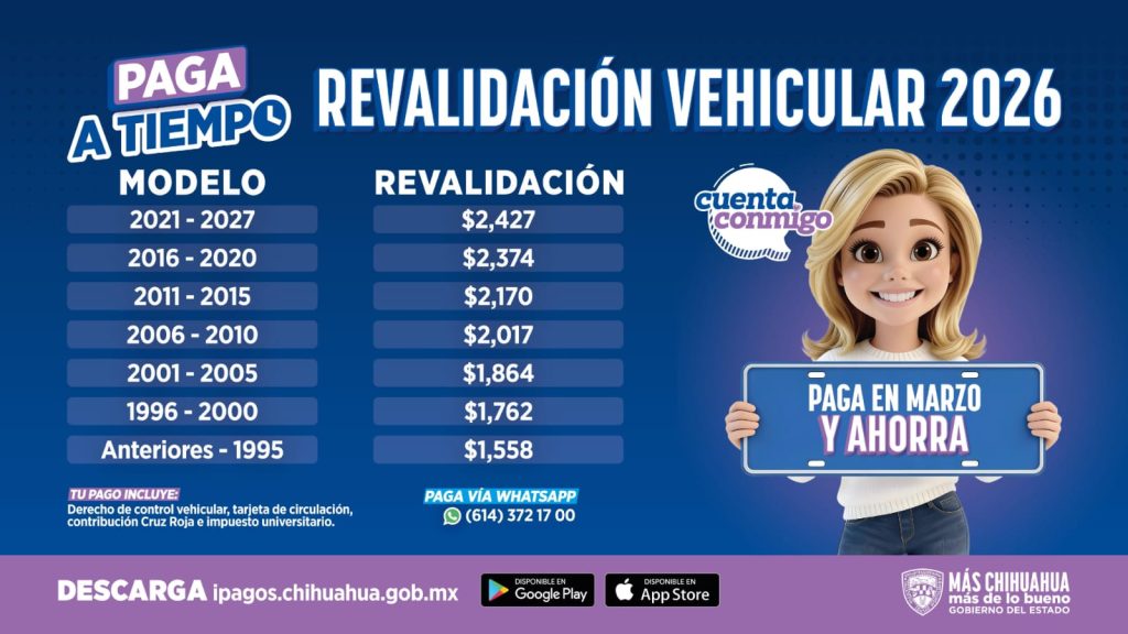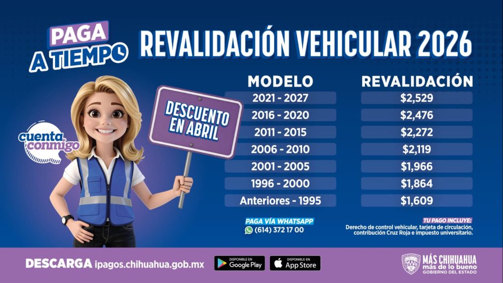 Chihuahua, Chih., — El Gobierno del Estado de Chihuahua informó que se mantendrán los costos y descuentos de la revalidación vehicular durante los meses de febrero, marzo y abril, con tarifas diferenciadas de acuerdo con el modelo del vehículo, además de facilidades de pago y esquemas de regularización para contribuyentes con adeudos.