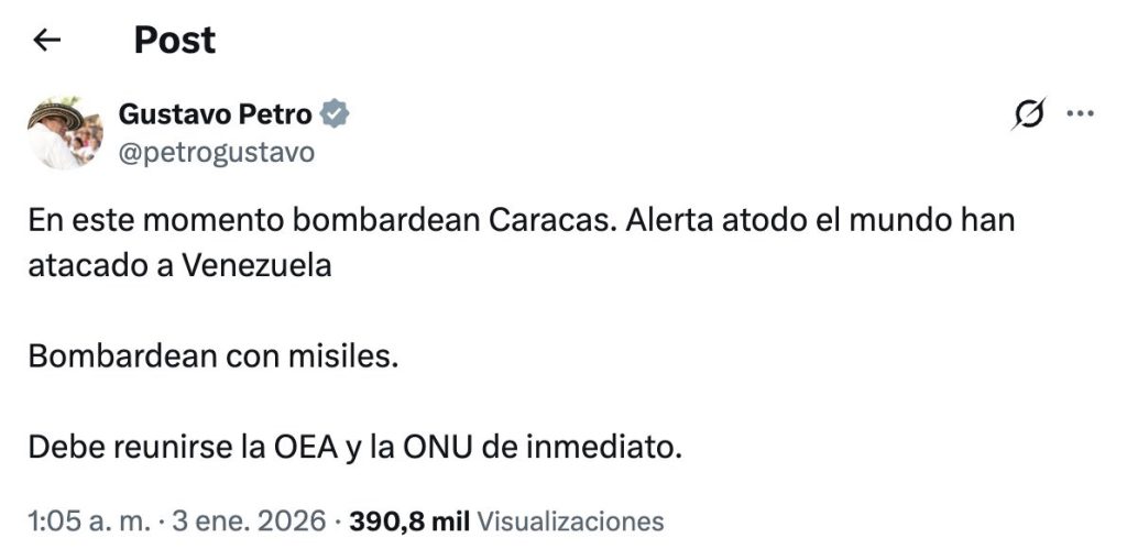 El mandatario colombiano publicó el mensaje en X (antes Twitter), señalando la gravedad de los hechos y la necesidad de una respuesta internacional inmediata ante la escalada de violencia en Venezuela.