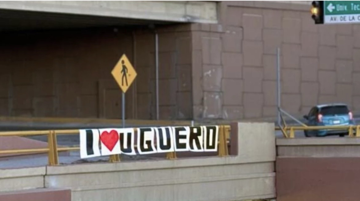 Las lonas fueron colocadas de manera estratégica para que el mensaje pudiera leerse de frente: “I <3 U Güero”, que en español significa “Te amo, Güero”. El detalle no pasó desapercibido entre automovilistas y peatones que transitaban por el lugar durante las primeras horas del 14 de febrero.
