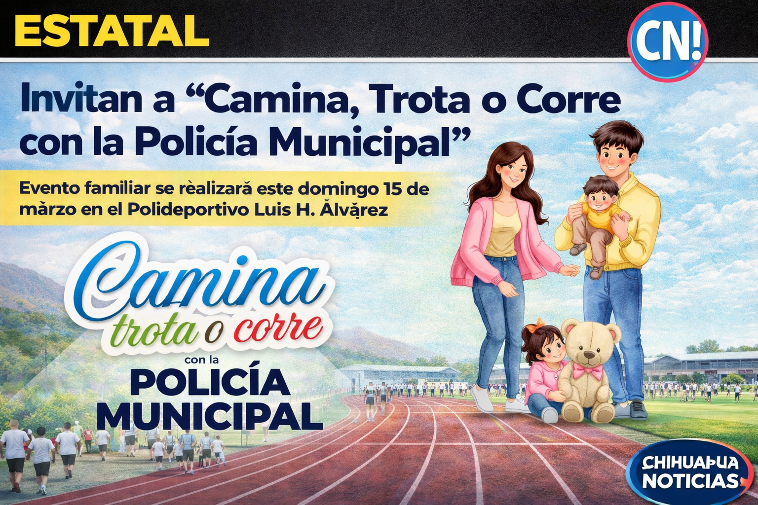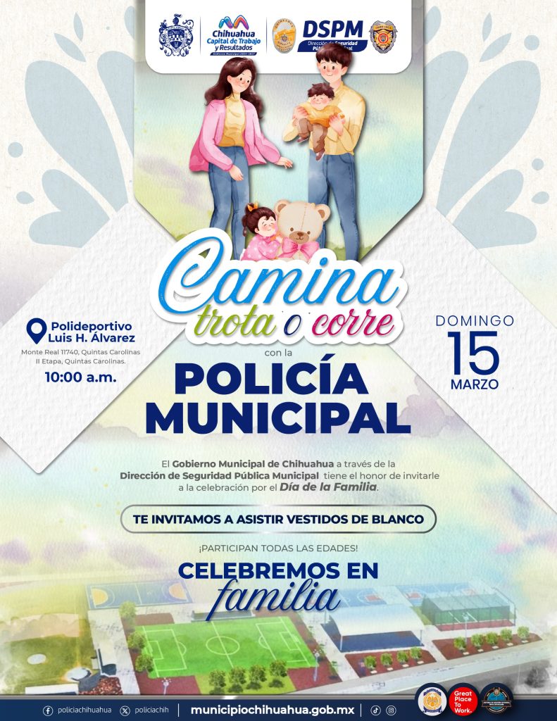 Chihuahua, Chih.— La Dirección de Seguridad Pública Municipal (DSPM) invitó a la ciudadanía a participar en la edición 2026 del evento “Camina, Trota o Corre con la Policía Municipal”, una actividad deportiva y familiar que se realizará este domingo 15 de marzo a las 10:00 horas en el Polideportivo Luis H. Álvarez.