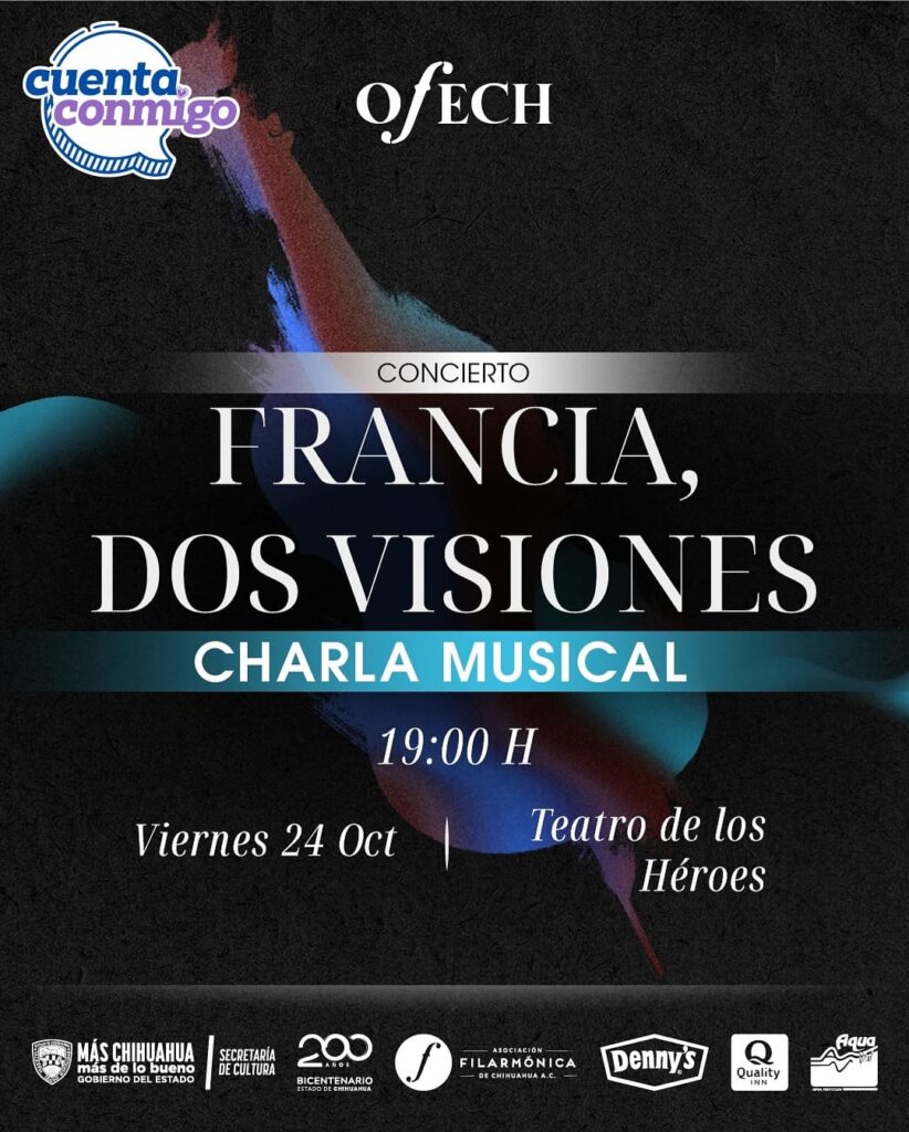La Secretaría de Cultura invita a la ciudadanía a disfrutar de un viaje musical a cargo de la Orquesta Filarmónica del Estado de Chihuahua (Ofech), con el concierto “Francia, Dos Visiones” y la tradicional charla previa al espectáculo.