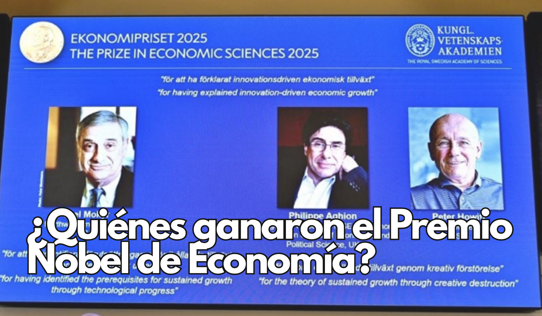 El premio, dotado con 11 millones de coronas suecas (aproximadamente 1,2 millones de dólares), se dividió en dos mitades. Una fue para Joel Mokyr, de la Universidad Northwestern, por “haber identificado los prerrequisitos para el crecimiento sostenido a través del progreso tecnológico”. La otra mitad fue concedida de forma conjunta a Philippe Aghion, del Collège de France e INSEAD, y a Peter Howitt, de la Universidad Brown, “por la teoría del crecimiento sostenido a través de la destrucción creativa”.