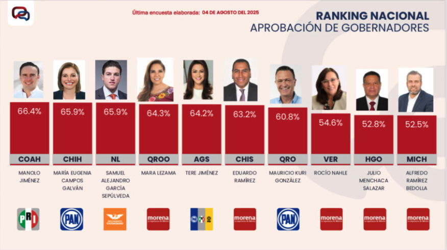 En el cuarto y quinto lugar aparecen dos mandatarias estatales: Mara Lezama, de Quintana Roo, y Tere Jiménez, de Aguascalientes, quienes también registraron altos niveles de aprobación ciudadana.