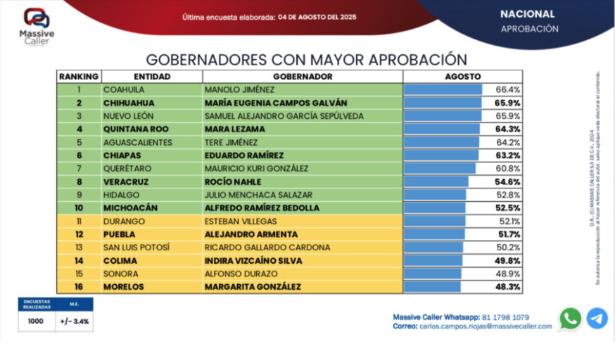 La más reciente encuesta nacional de Massive Caller, que evalúa el desempeño de los 32 gobernadores del país, colocó a Maru Campos, gobernadora de Chihuahua, en el segundo lugar de aprobación, con un 65.9%.