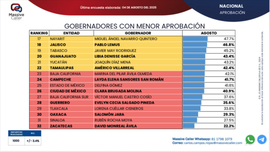 Por otro lado, los gobernadores peor evaluados en esta medición fueron: