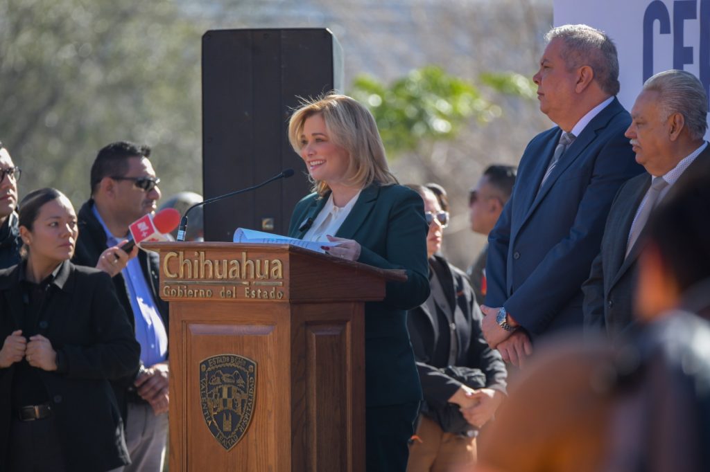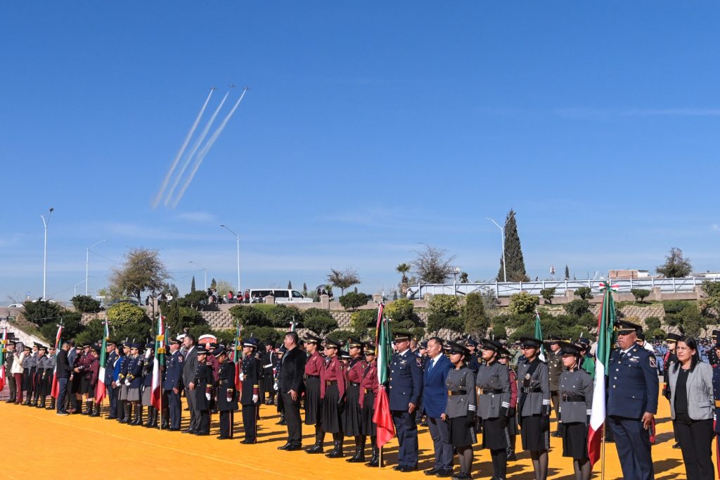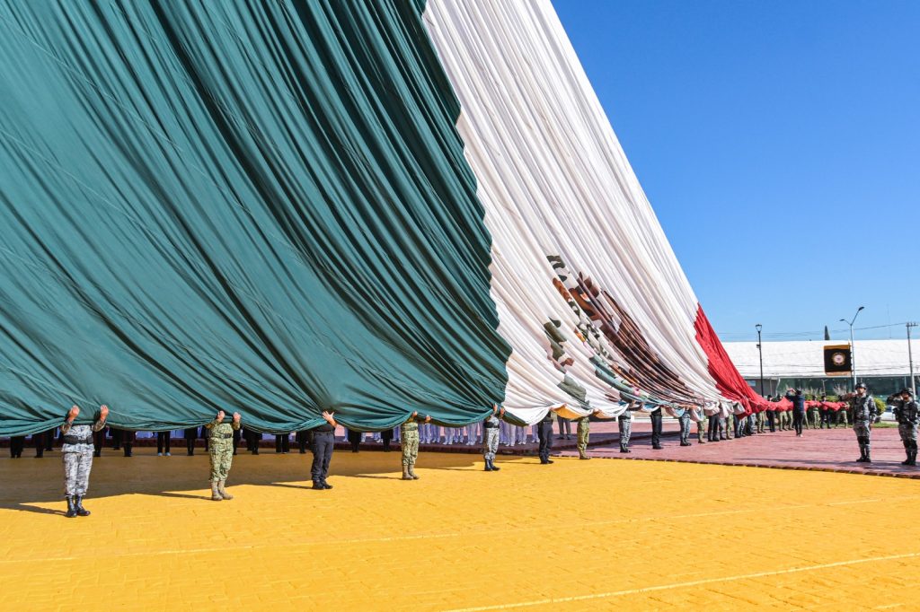 En el marco del 205 aniversario del Día de la Bandera, la gobernadora Maru Campos encabezó la ceremonia de izamiento en el Parque El Palomar, donde exhortó a estudiantes de 18 planteles de la capital a confiar en un México con instituciones fuertes, respeto a la ley y vocación de paz.