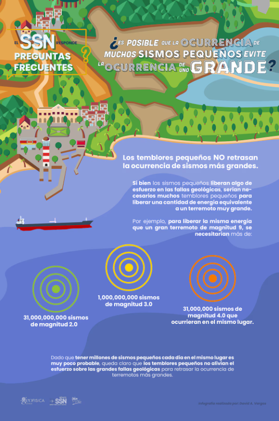 De acuerdo con una infografía explicativa difundida por el propio SSN, los sismos pequeños no retrasan la ocurrencia de terremotos mayores. Aunque liberan una mínima parte del esfuerzo acumulado en las fallas geológicas, la cantidad necesaria para equivaler a un gran sismo es astronómica.