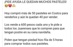 Pidió ayuda para vender pasteles de Costco en redes sociales Luego de que se presentara esta situación, una usuaria en redes sociales solicitó ayuda urgente para que estos pasteles pudieran ser vendidos, haciendo del conocimiento público este caso.