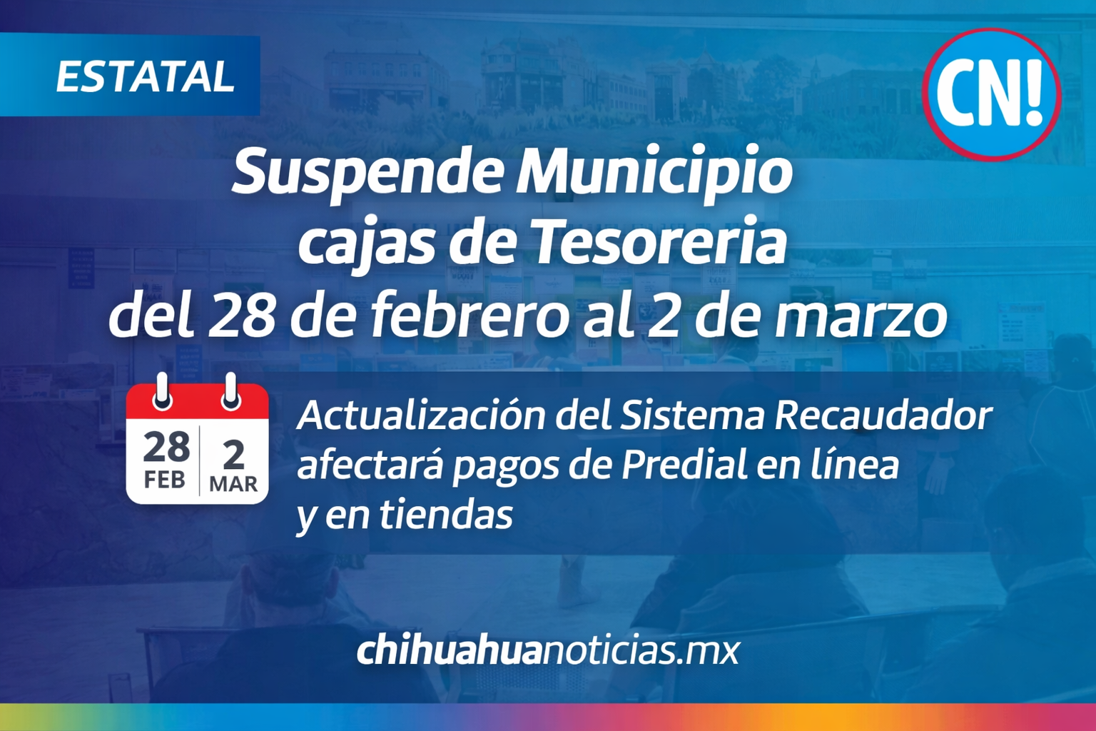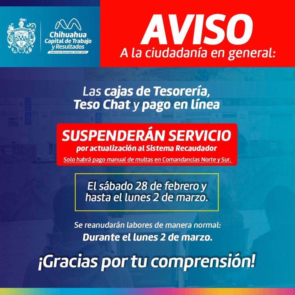 . El Gobierno Municipal de Chihuahua informó que las cajas receptoras de la Tesorería Municipal suspenderán temporalmente el servicio de pagos desde el sábado 28 de febrero y hasta el lunes 2 de marzo, debido a trabajos de actualización en el Sistema Recaudador.