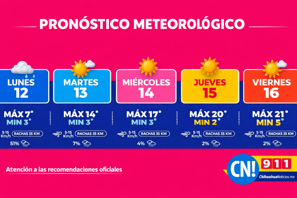 Chihuahua, Chih., – La Coordinación Municipal de Protección Civil informó que durante la semana del lunes 12 al viernes 16 de enero se registrarán mañanas y noches frías en la ciudad de Chihuahua, con un ascenso gradual en las temperaturas máximas conforme avance la semana.
