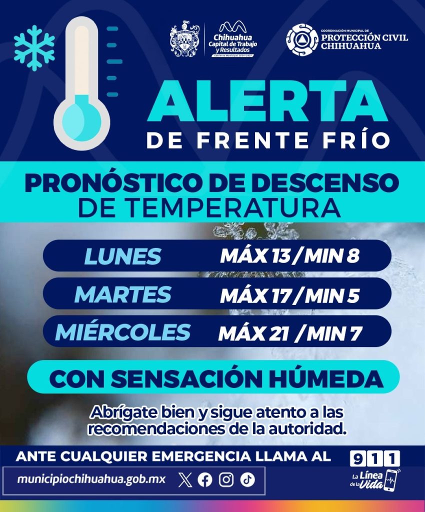 El Municipio de Chihuahua, a través de la Coordinación Municipal de Protección Civil, emitió un llamado preventivo ante el marcado descenso de temperaturas que se registrará en la capital del estado durante los primeros días de la próxima semana, principalmente lunes y martes, debido al ingreso del frente frío número 25 y una masa de aire ártico.