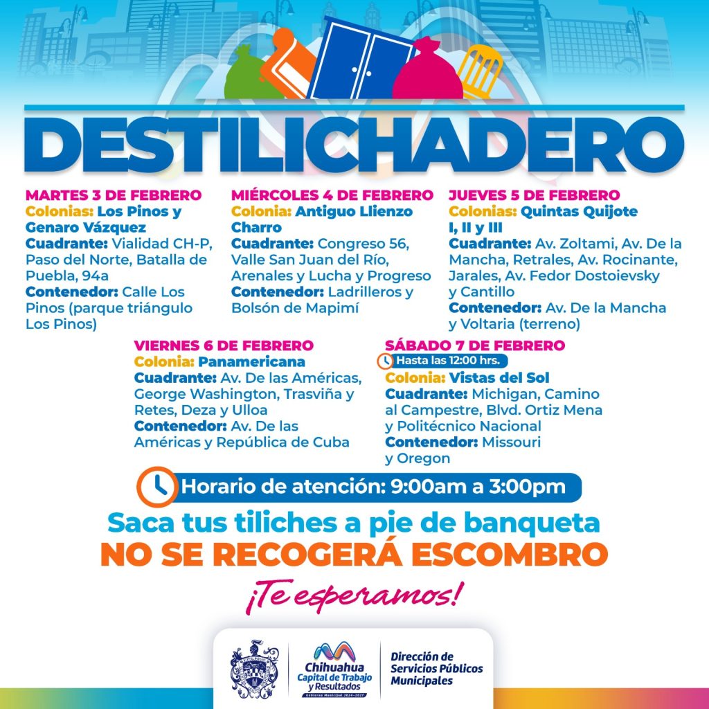 Con el objetivo de prevenir focos de infección, plagas y riesgos sanitarios derivados de la acumulación de residuos voluminosos en viviendas, el Gobierno Municipal de Chihuahua, a través de la Dirección de Servicios Públicos Municipales, dio a conocer el calendario del programa Destilichadero, el cual se llevará a cabo del 3 al 7 de febrero en ocho colonias de la capital.