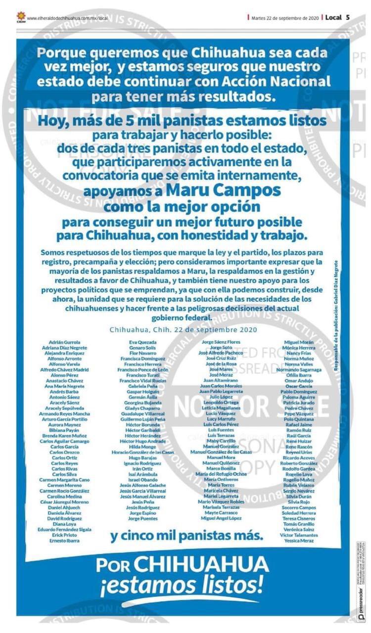 Mediante una plana dedicada en el periódico “El Heraldo de Chihuahua” más de cinco mil panistas de todo el Estado anuncian su apoyo total a la actual Presidenta Municipal de Chihuahua, María Eugenia Campos, para que sea la candidata de ese partido al Gobierno del Estado.
