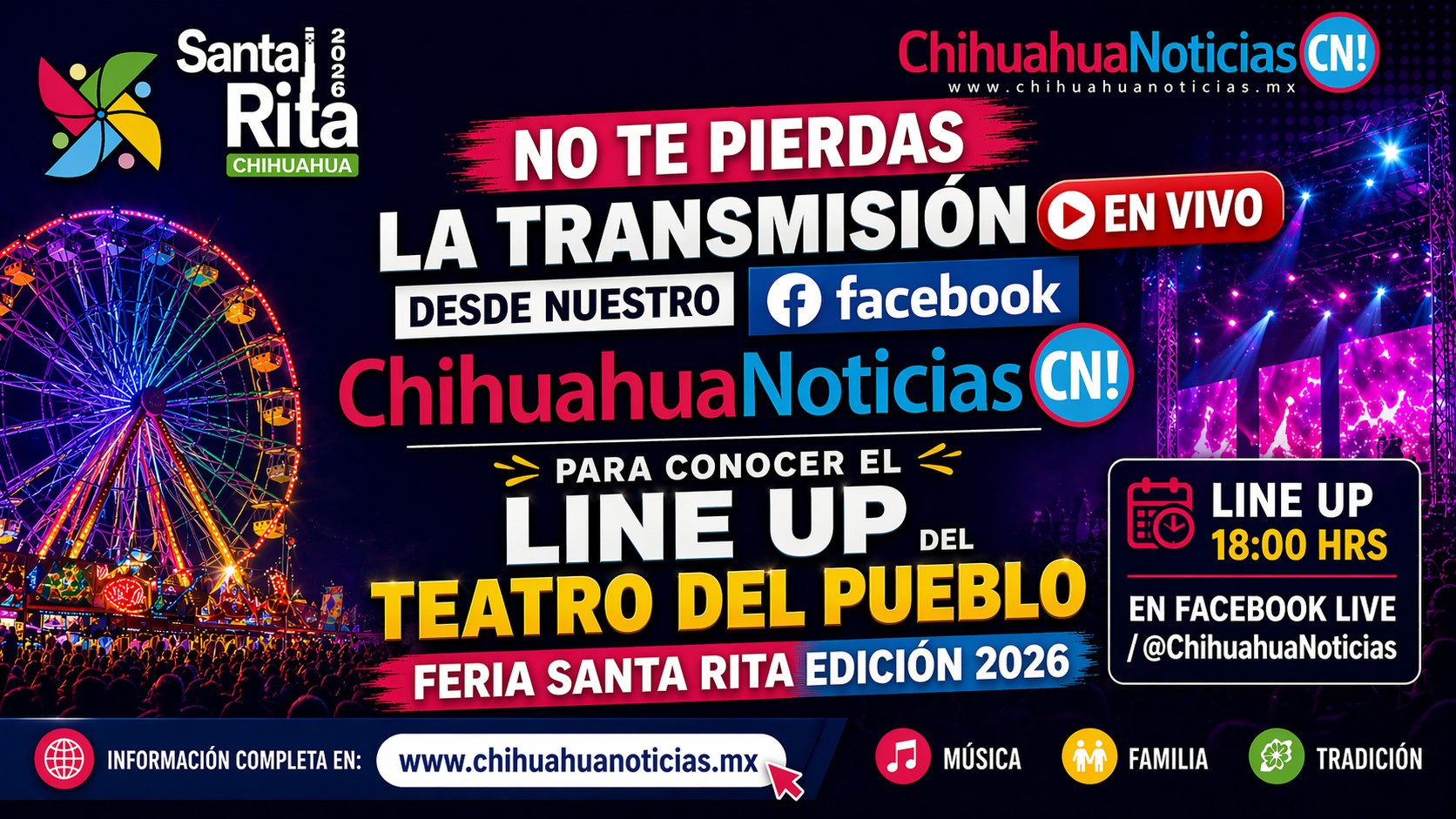 El anuncio oficial será transmitido completamente en vivo a través del Facebook de Chihuahua Noticias, donde se revelarán los artistas confirmados, fechas de presentación y detalles clave de la cartelera que marcará esta edición 2026.