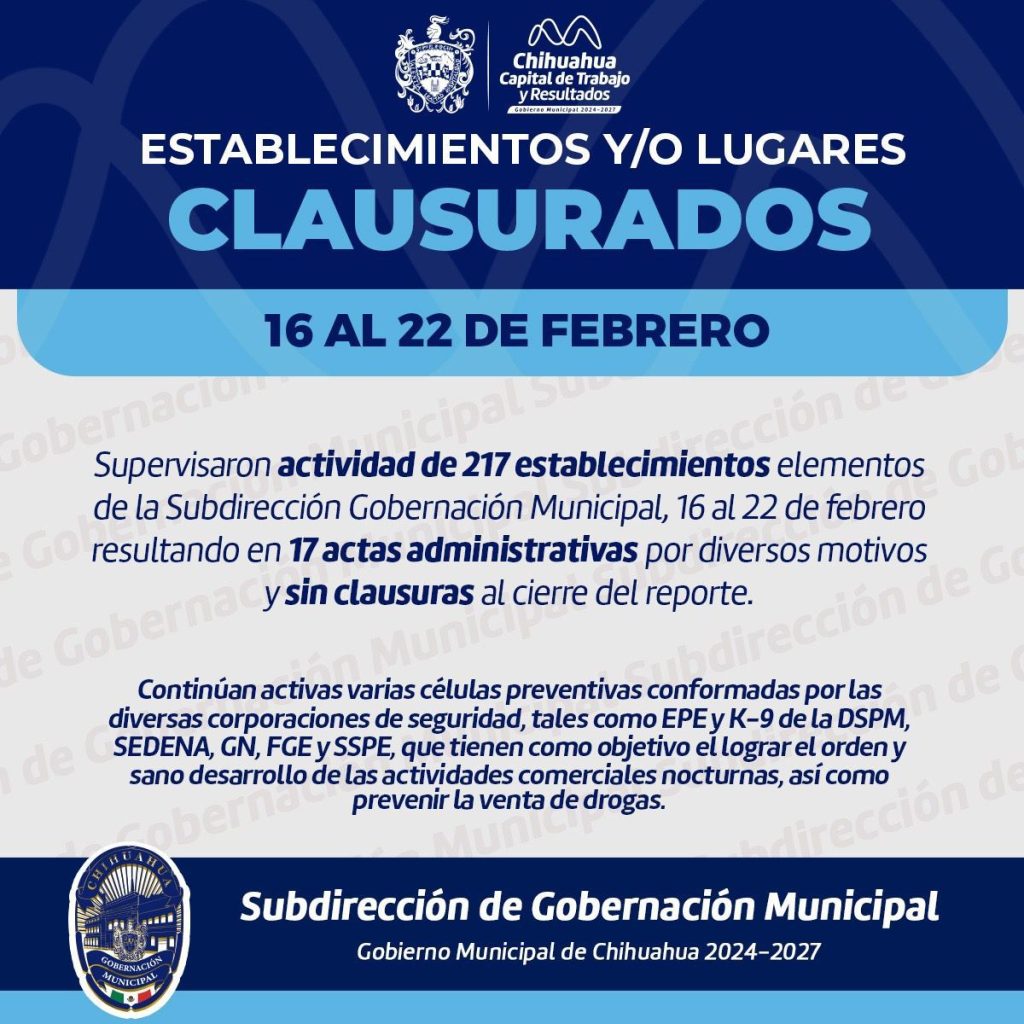 El Gobierno Municipal de Chihuahua, a través de la Subdirección de Gobernación de la Secretaría del H. Ayuntamiento, informó que del 16 al 22 de febrero se realizaron 217 inspecciones a locales y establecimientos comerciales en la capital del estado.