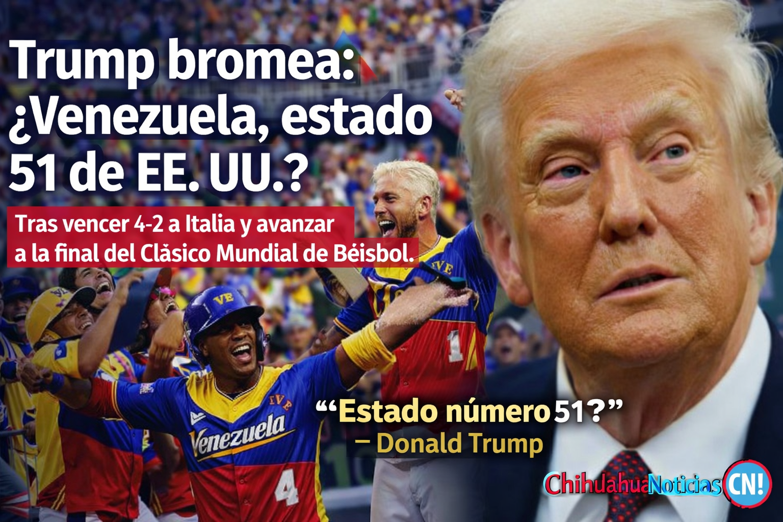 “¡Wow! Venezuela derrotó a Italia esta noche 4-2 en la semifinal del Clásico Mundial de Béisbol. Se ven realmente muy bien. ¡Le están pasando cosas buenas a Venezuela últimamente! Me pregunto a qué se debe esta ‘magia’. ¿Venezuela como el estado 51?”, escribió Trump.