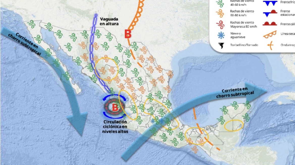Además, se prevén vientos sostenidos de 30 a 40 km/h, con rachas que podrían alcanzar entre 50 y 70 km/h, lo que incrementa el riesgo de tolvaneras, caída de árboles y afectaciones a estructuras ligeras.